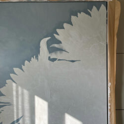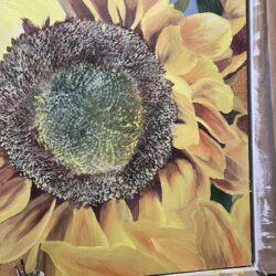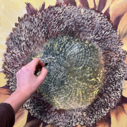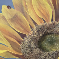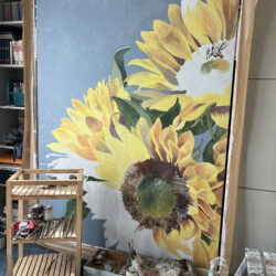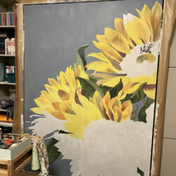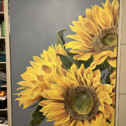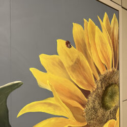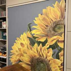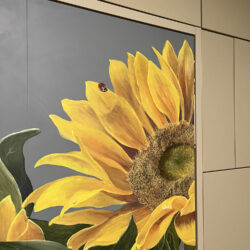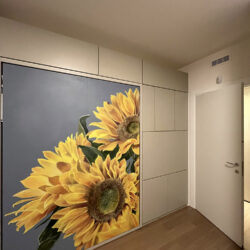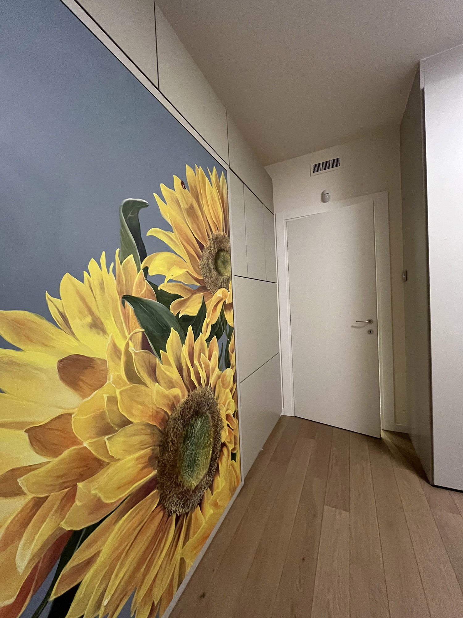 In un piccolo studio che all’occorrenza diventa una camera ospiti, un grande pannello maschera il letto a scomparsa. Le armadiature sono tutte in tono neutro, tra il grigio e il tortora. Non c’è spazio alle pareti per appendere quadri e dare colore alla stanza e quindi il proprietario di casa mi ha chiesto di sfruttare proprio questo pannello come una grande tela e così ho pensato a dei grandi girasoli, che danno colore, vitalità e gioia. Una coccinella dà un tocco di colore diverso e come sempre è una piccola mascotte portafortuna.