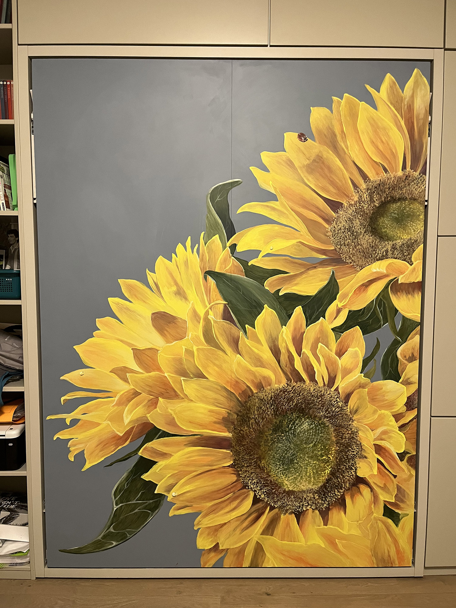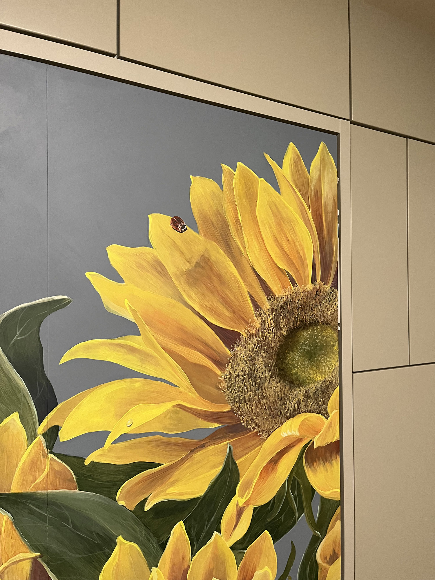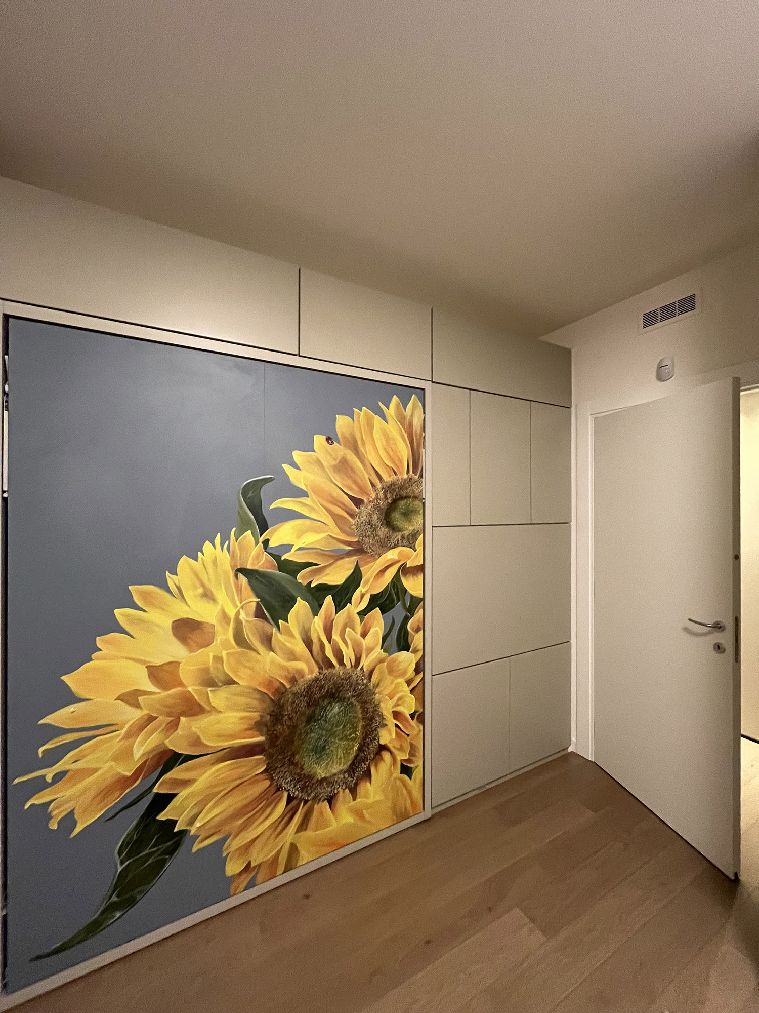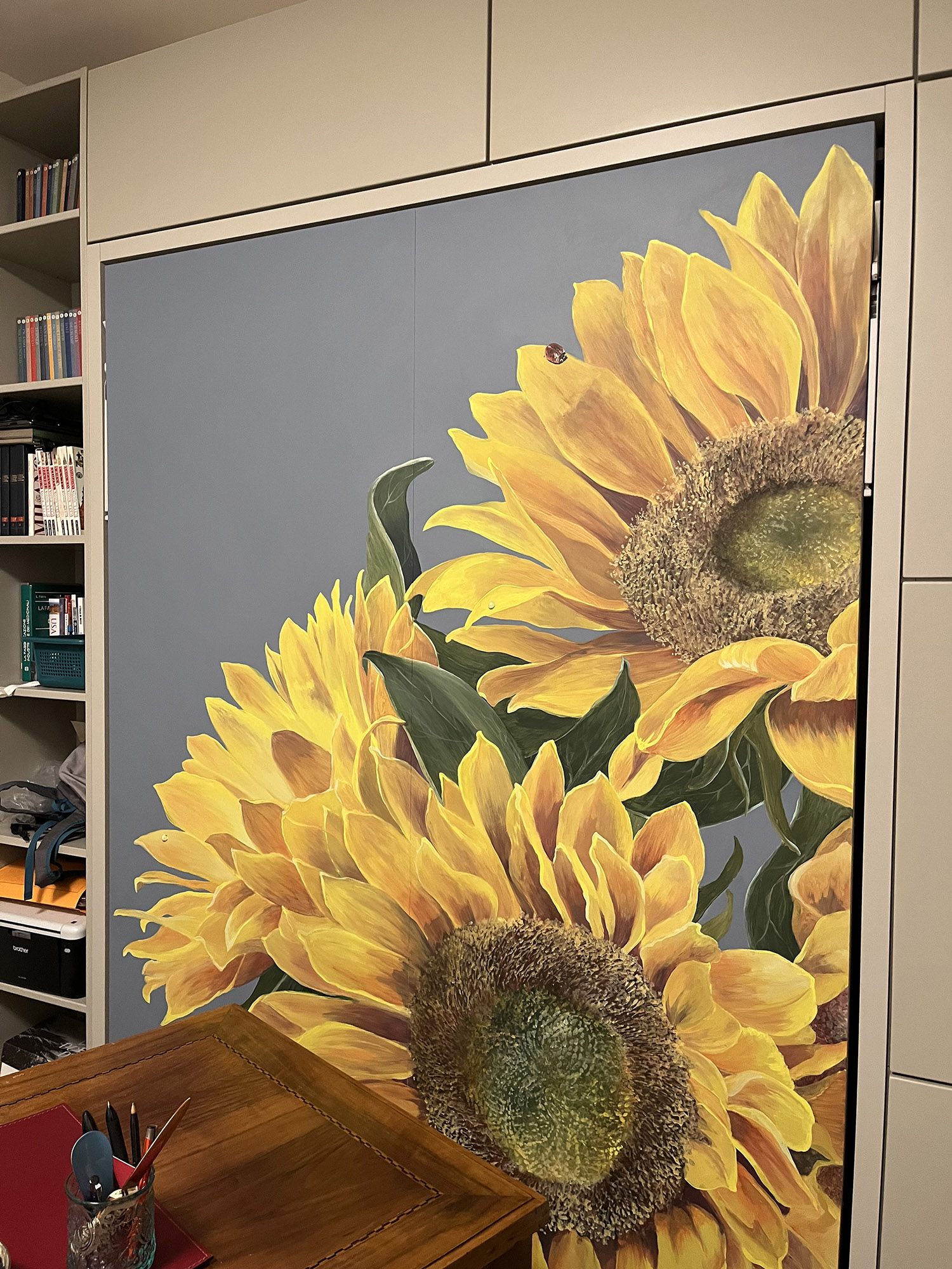 In un piccolo studio che all’occorrenza diventa una camera ospiti, un grande pannello maschera il letto a scomparsa. Le armadiature sono tutte in tono neutro, tra il grigio e il tortora. Non c’è spazio alle pareti per appendere quadri e dare colore alla stanza e quindi il proprietario di casa mi ha chiesto di sfruttare proprio questo pannello come una grande tela e così ho pensato a dei grandi girasoli, che danno colore, vitalità e gioia. Una coccinella dà un tocco di colore diverso e come sempre è una piccola mascotte portafortuna.
