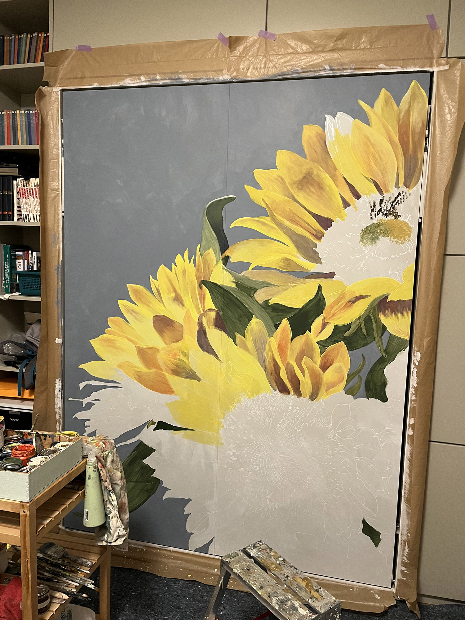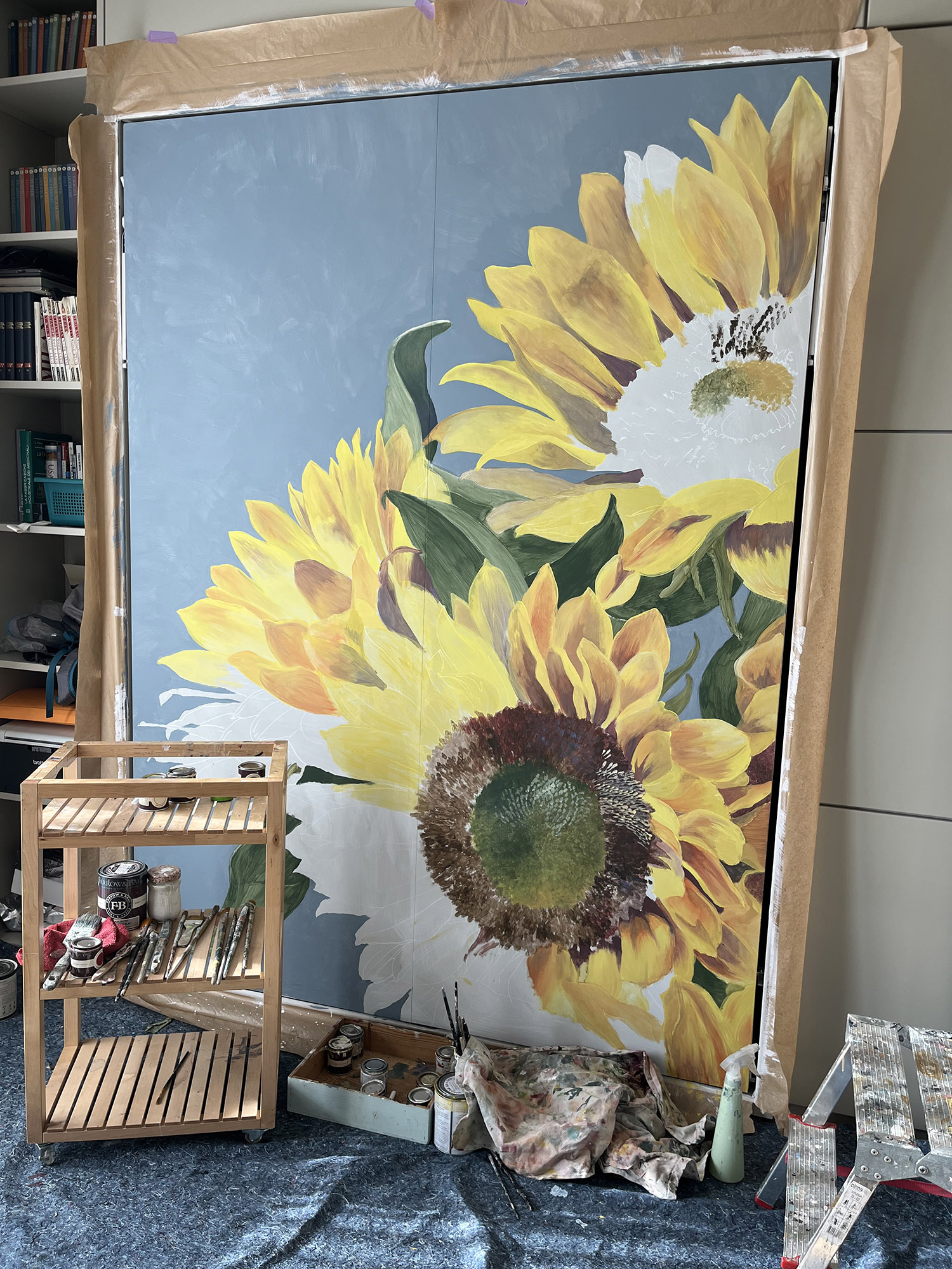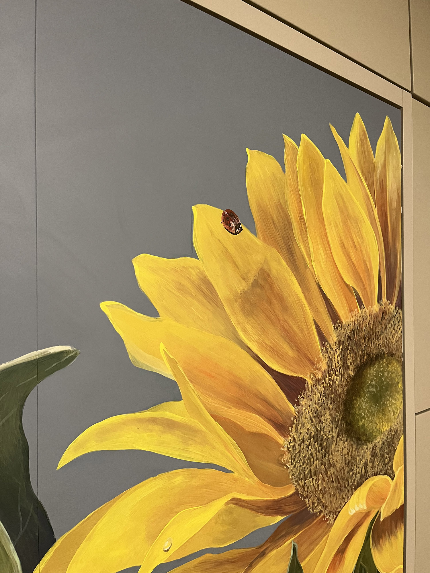 In un piccolo studio che all’occorrenza diventa una camera ospiti, un grande pannello maschera il letto a scomparsa. Le armadiature sono tutte in tono neutro, tra il grigio e il tortora. Non c’è spazio alle pareti per appendere quadri e dare colore alla stanza e quindi il proprietario di casa mi ha chiesto di sfruttare proprio questo pannello come una grande tela e così ho pensato a dei grandi girasoli, che danno colore, vitalità e gioia. Una coccinella dà un tocco di colore diverso e come sempre è una piccola mascotte portafortuna.