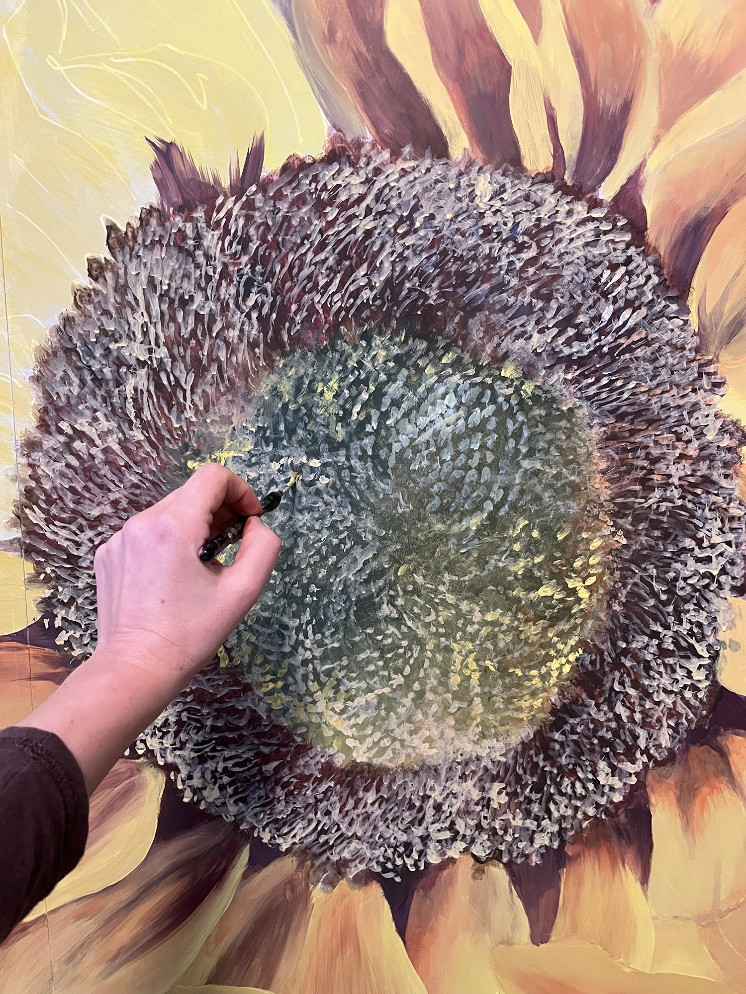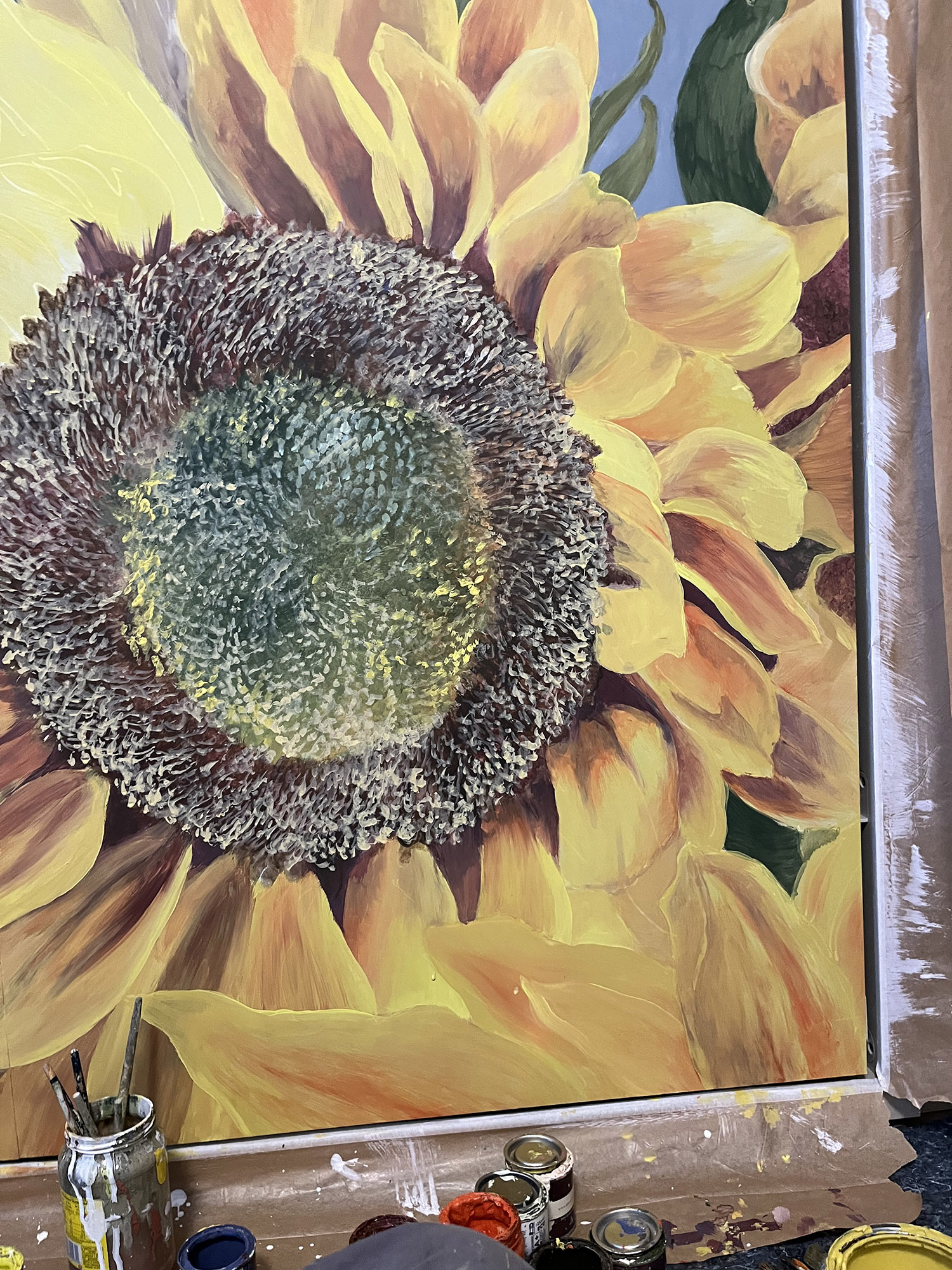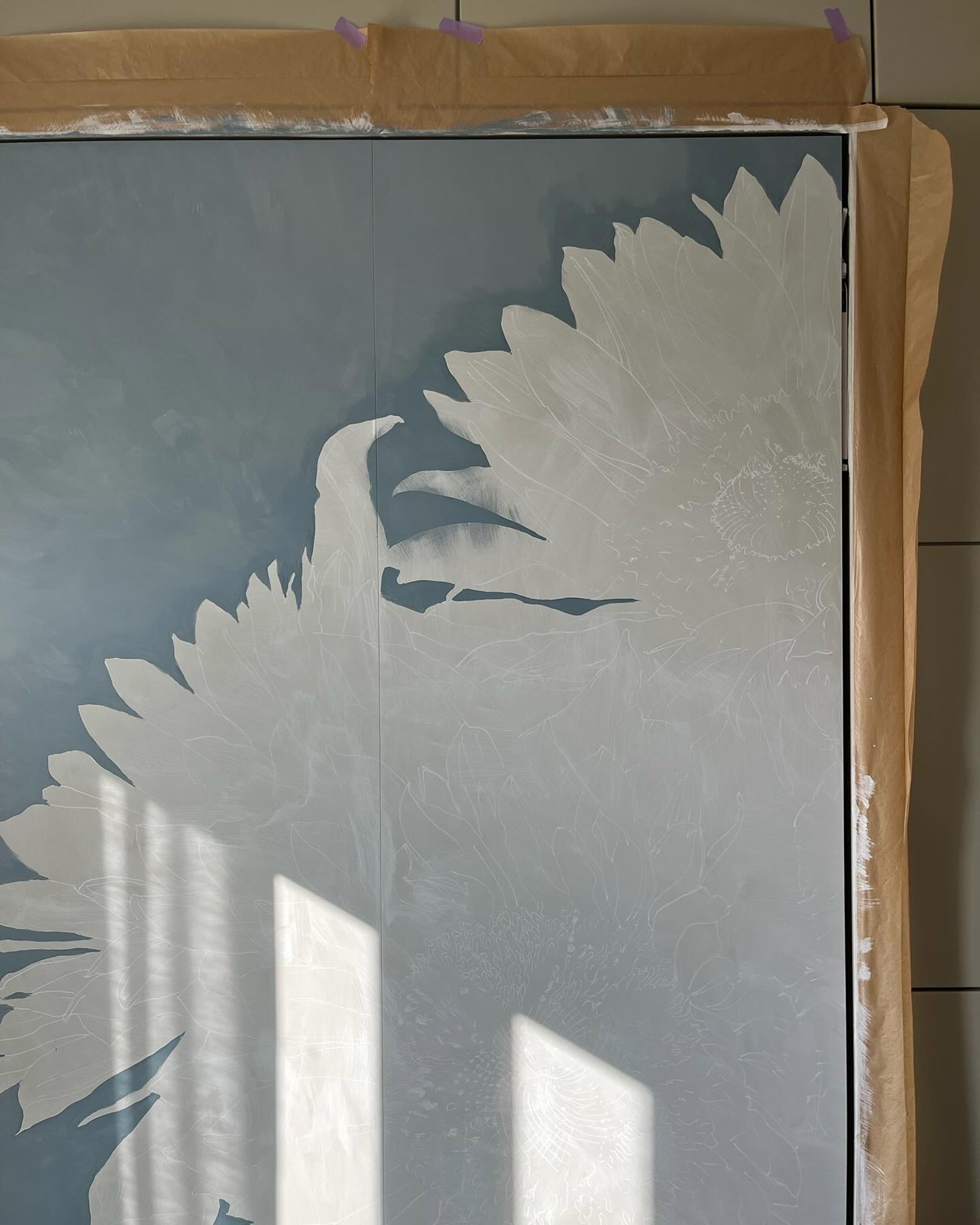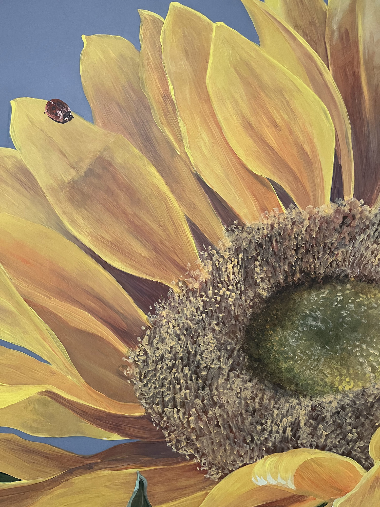 In un piccolo studio che all’occorrenza diventa una camera ospiti, un grande pannello maschera il letto a scomparsa. Le armadiature sono tutte in tono neutro, tra il grigio e il tortora. Non c’è spazio alle pareti per appendere quadri e dare colore alla stanza e quindi il proprietario di casa mi ha chiesto di sfruttare proprio questo pannello come una grande tela e così ho pensato a dei grandi girasoli, che danno colore, vitalità e gioia. Una coccinella dà un tocco di colore diverso e come sempre è una piccola mascotte portafortuna.